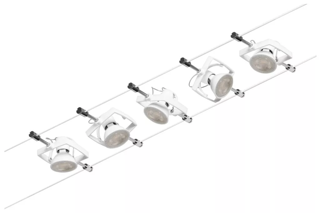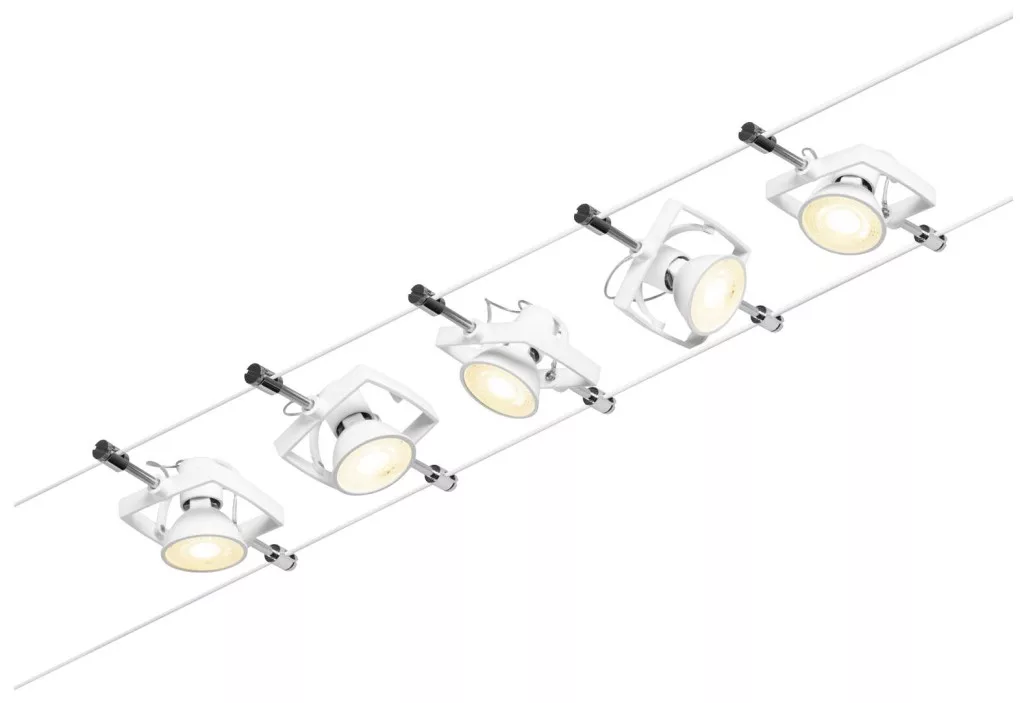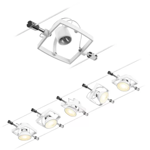 Műszaki adatok: 2021-es energiahatékonysági osztályok: n.rel. · Foglalat: GU5.3 · Fényforrások száma: 5 · Gyártói szín: Fehér (matt), Króm · Helyiség: Dolgozószoba, Gyerekszoba, Konyha, Hálószoba, Nappali/étkező · Kötél távolság: 160 mm · Kötélhossz: 10 m · Védelmi osztály: II · Üzemi feszültség: 230 V