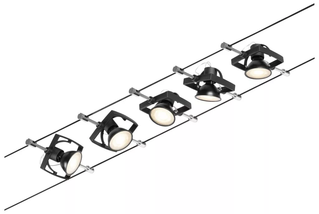 Műszaki adatok: 2021-es energiahatékonysági osztályok: n.rel. · Foglalat: GU5.3 · Fényforrások száma: 5 · Gyártói szín: Fekete (matt), Króm · Helyiség: Dolgozószoba, Gyerekszoba, Konyha, Hálószoba, Nappali/étkező · Kötél távolság: 160 mm · Kötélhossz: 10 m · Védelmi osztály: II · Üzemi feszültség: 230 V