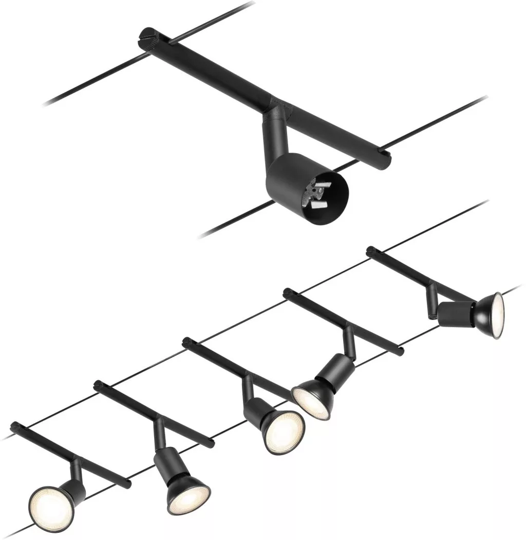 Műszaki adatok: 2021-es energiahatékonysági osztályok: n.rel. · Foglalat: GU5.3 · Fényforrások száma: 5 · Gyártói szín: Fekete (matt), Króm · Helyiség: Dolgozószoba, Gyerekszoba, Konyha, Hálószoba, Nappali/étkező · Kötél távolság: 160 mm · Kötélhossz: 10 m · Védelmi osztály: II · Üzemi feszültség: 230 V
