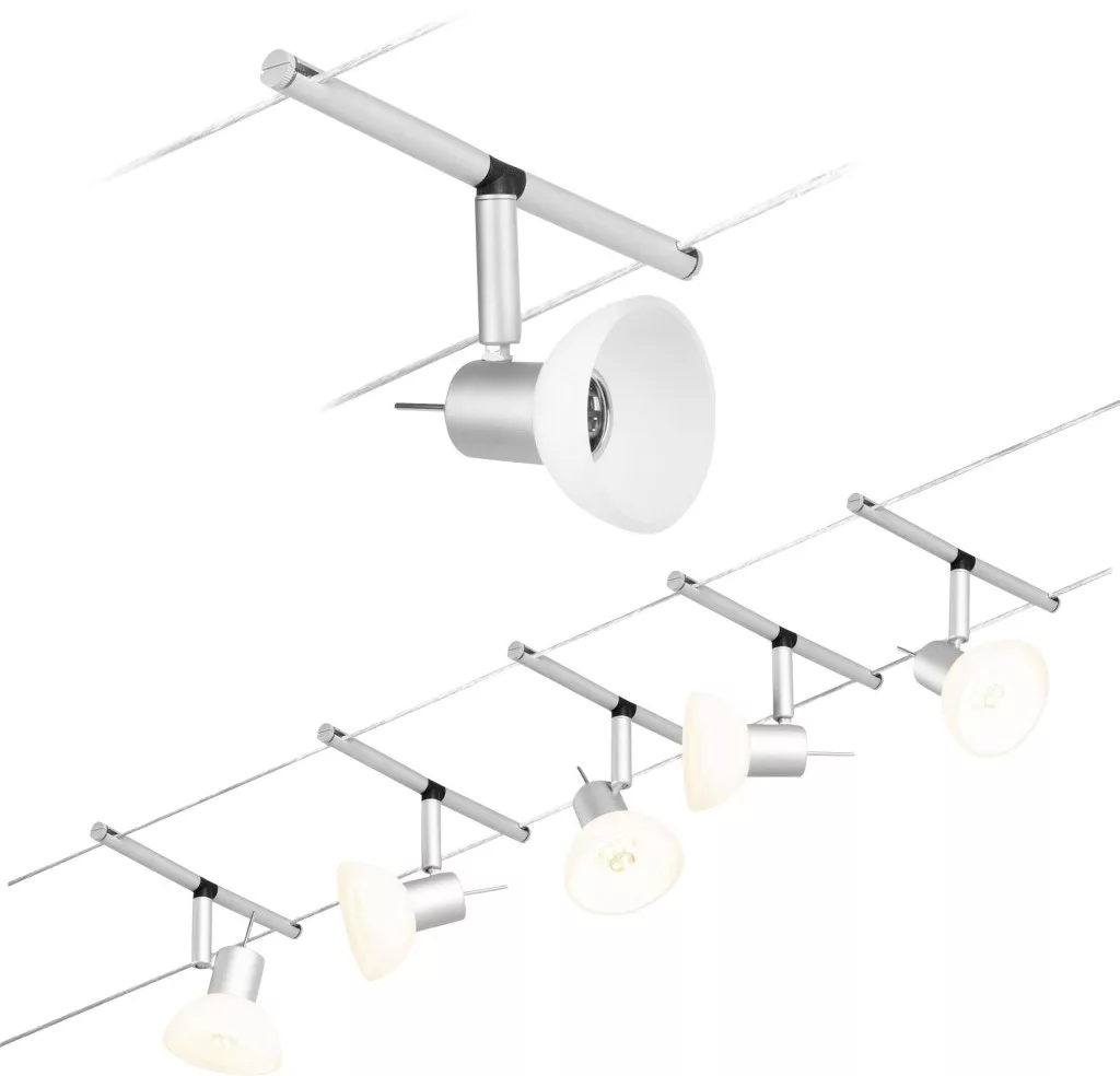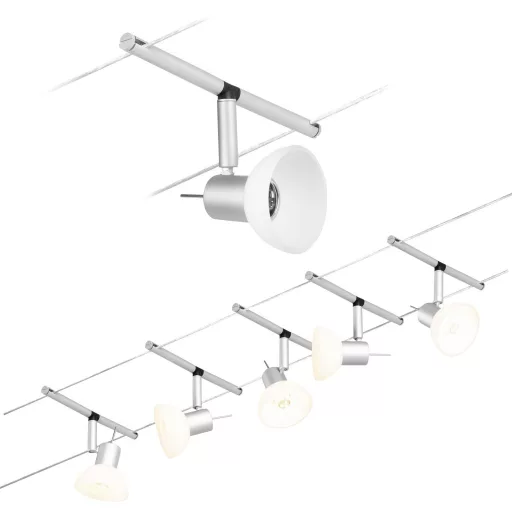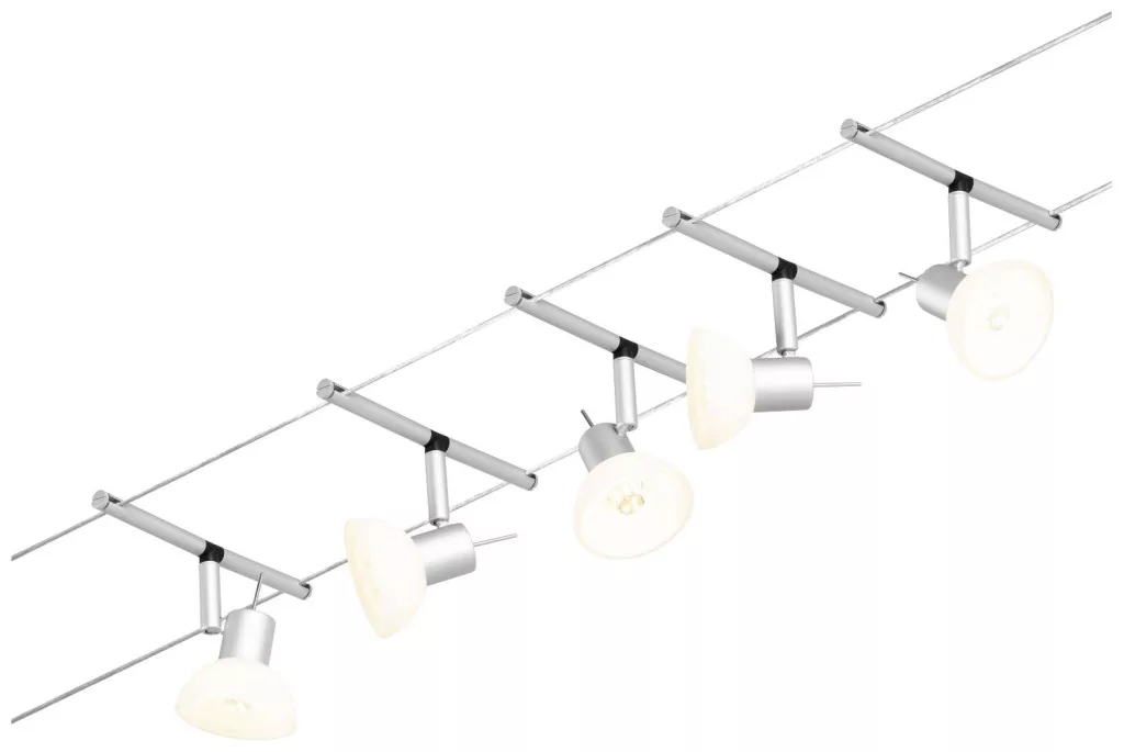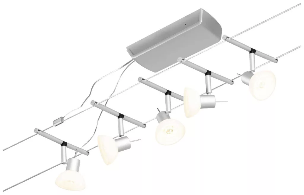 Műszaki adatok: 2021-es energiahatékonysági osztályok: n.rel. · Foglalat: GU5.3 · Fényforrások száma: 5 · Gyártói szín: Króm (matt) · Helyiség: Dolgozószoba, Gyerekszoba, Konyha, Hálószoba, Nappali/étkező · Kötél távolság: 160 mm · Kötélhossz: 10 m · Védelmi osztály: II · Üzemi feszültség: 230 V