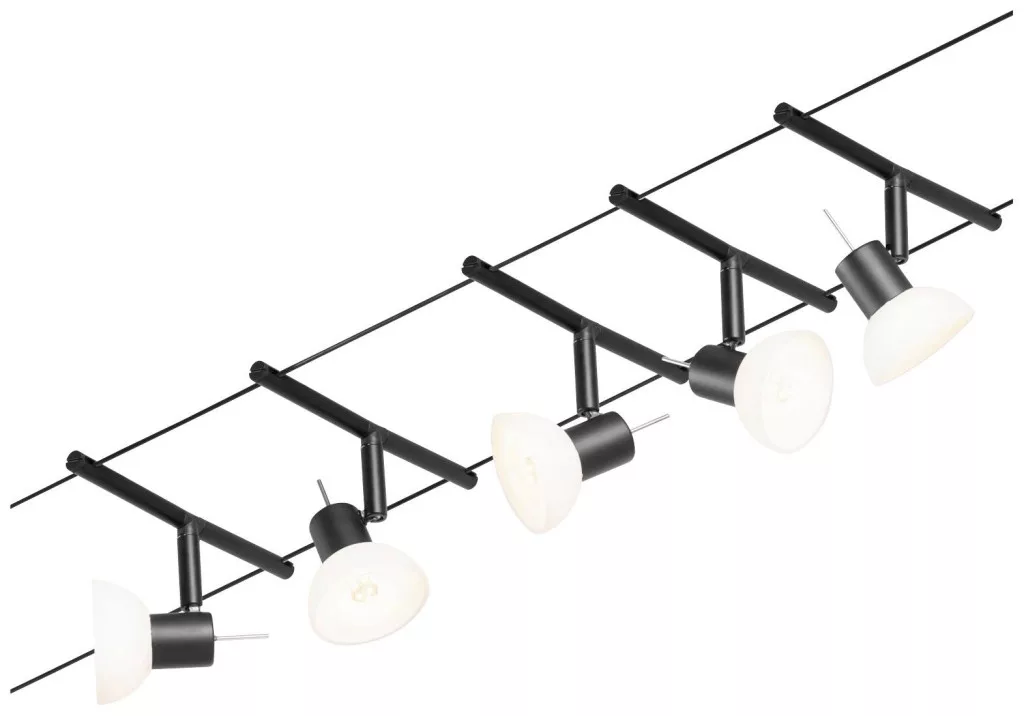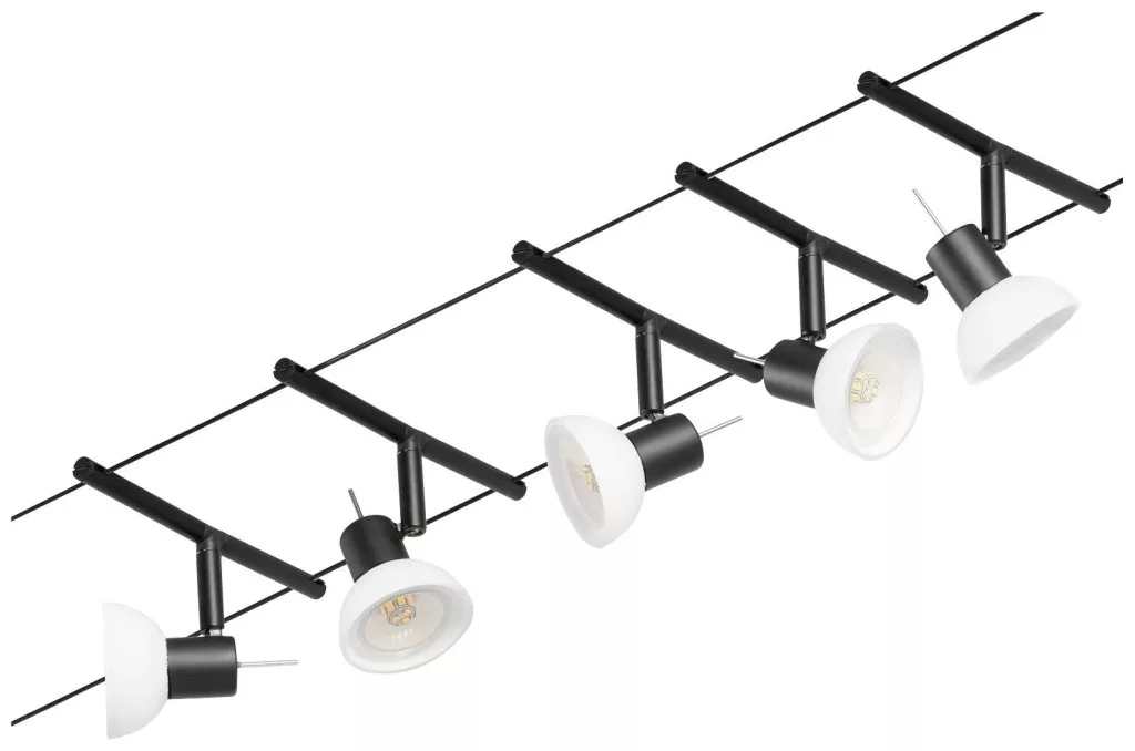 Technical specifications: 2021-es energiahatékonysági osztályok: n.rel. · Foglalat: GU5.3 · Fényforrások száma: 5 · Kötél távolság: 160 mm · Kötélhossz: 10 m · Space (lights): Dolgozószoba,Gyerekszoba,Konyha,Hálószoba,Nappali/étkező · Szín: Fekete (matt),Króm · Védelmi osztály: II · Üzemi feszültség: 230 V