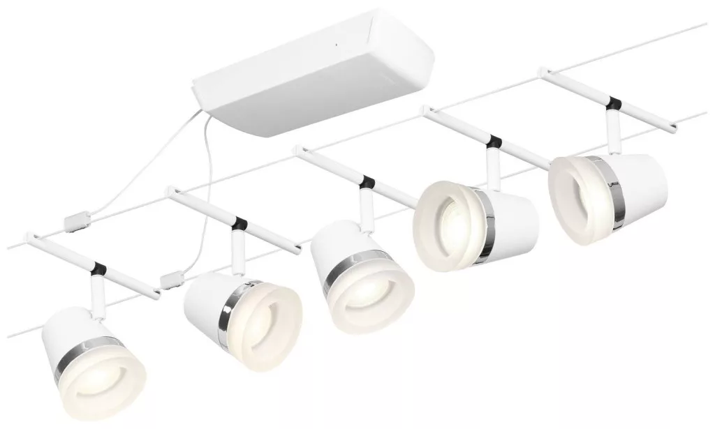 Műszaki adatok: 2021-es energiahatékonysági osztályok: n.rel. · Foglalat: GU5.3 · Fényforrások száma: 5 · Gyártói szín: Fehér (matt), Króm · Helyiség: Dolgozószoba, Gyerekszoba, Konyha, Hálószoba, Nappali/étkező · Kötél távolság: 160 cm · Méret, hossz: 10 mm · Méret, magasság: 145 mm · Méret, szélesség: 94 mm · Védelmi osztály: II · Átmérő: 84 mm · Üzemi feszültség: 230 V