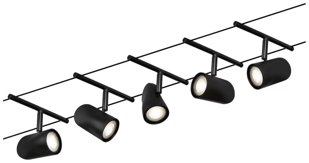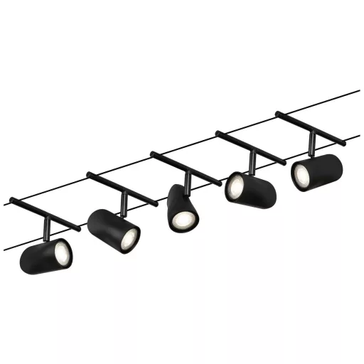 A matt fekete # króm kupasorozat 5 lámpa nélküli lámpával felszerelhető a falra és a mennyezetre is, így korlátlan tervezési lehetőségeket kínál. Nem számít, hogy egyenes, ferde vagy ferde - a kábelrendszerek minden helyiségbe illeszkednek, és problémamegoldók a nehéz telepítési körülmények között. Az alapkészlet egyénileg kiegészíthető egyedi foltokkal, terelőkkel és egyéb kiegészítőkkel. A 10 m hosszú kötél középen felosztható, így a rendszer maximum 5 m -re nyújtható. Ezzel a rendszerrel optimális fényeloszlás valósítható meg, növekvő fényigénnyel könnyen bővíthető. Csak egy konnektor szükséges a lámpák elosztásához a helyiségben. A 12 V egyenáramú (egyenfeszültségű) technológiával rendelkező rendszereket nem lehet tompítani a beépített fali fényerő-szabályozó segítségével.