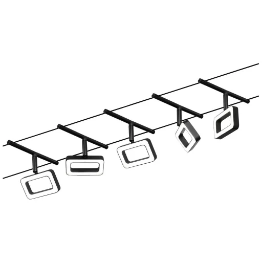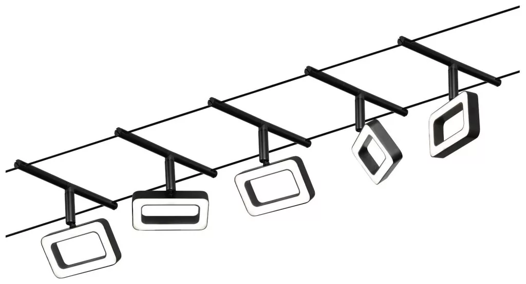 A matt fekete # króm Frame sorozat 5 LED -es fénnyel felszerelhető a falra és a mennyezetre is, így korlátlan tervezési lehetőségeket kínál. Nem számít, hogy egyenes, ferde vagy ferde - a kábelrendszerek minden helyiségbe illeszkednek, és problémamegoldók a nehéz telepítési körülmények között. Az alapkészlet egyénileg kiegészíthető egyedi foltokkal, terelőkkel és egyéb kiegészítőkkel. A 10 m hosszú kötél középen felosztható, így a rendszer maximum 5 m -re nyújtható. Ezzel a rendszerrel optimális fényeloszlás valósítható meg, növekvő fényigénnyel könnyen bővíthető. Csak egy konnektor szükséges a lámpák elosztásához a helyiségben. A 12 V egyenáramú (egyenfeszültségű) technológiával rendelkező rendszereket nem lehet tompítani a beépített fali fényerő-szabályozó segítségével.