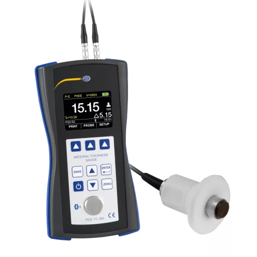 Das PCE-TG 300-HT5 ist ein Wanddickenmessgerät mit speziellen Sensoren für verschiedenste Anwendungen. Generell können die Wanddicken von allen homogenen Werkstoffen mit dem Ultraschall-Material-Dickenmessgerät vermessen werden. Für dämpfende bzw. streuende Werkstoffe wie Kunststoff oder Guss ist ein spezieller Sensor erhältlich. Ein abgewinkelter 90° Sensor ermöglich auch Messungen an schwer zugänglichen Messstellen. Die Schallgeschwindigkeit kann frei am Wanddickenmessgerät eingestellt und somit auf unterschiedlichste Materialien angepasst werden.Auf dem gut ablesbaren TFT Farbdisplay werden die Messwerte direkt dargestellt. Durch den internen Speicher, welcher über die optional erhältliche Software ausgelesen werden kann, können unterschiedliche Messstellen eindeutig gespeichert werden. Das zerstörungsfreie Ultraschallmessverfahren ermöglicht die Messung auch an Endprodukten. Durch den Echo-Echo Arbeitsmodus können selbst beschichtete Werkstücke vermessen werden.