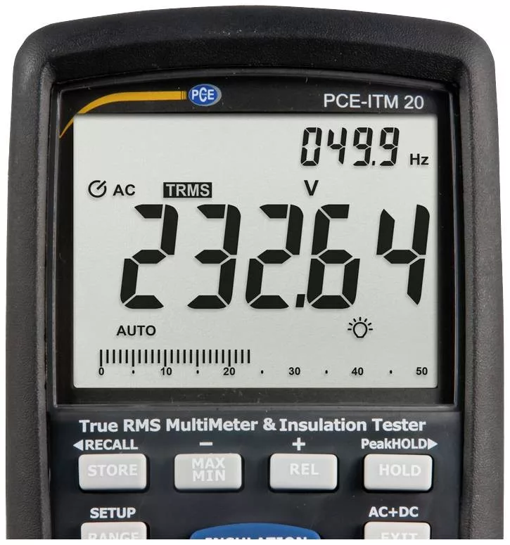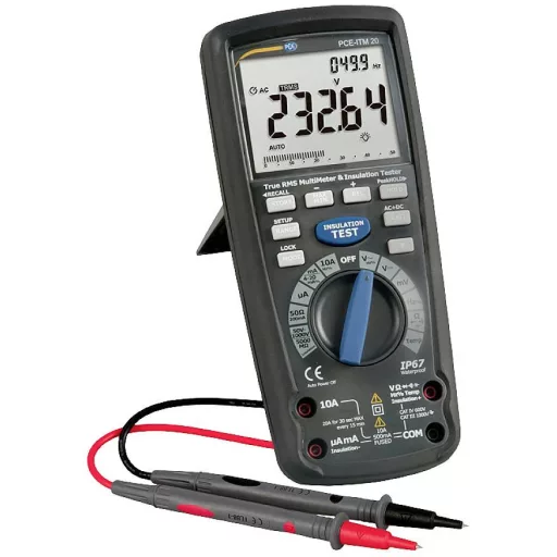 Ampermérő PCE-ITM 20 A szigetelési multiméter egy multiméter és szigetelésvizsgáló egy mérőeszközben / 1000 V-ig tesztelő feszültség / nagy LCD kijelző / hőmérsékletmérés / frekvencia mérés / belső memória / CAT IV 600 V / IP67 Ez a szigetelési multiméter PCE- Az ITM 20 egy sokoldalú szigetelési multimétert köt össze egy szigetelésvizsgálóval. A szokásos mért változókon, például feszültség, áramerősség és ellenállás mellett ez a szigetelési multiméter frekvencia- és kapacitásméréssel is fel van szerelve. A hőmérsékletmérés a szállítási terjedelemben található hőelem segítségével is elvégezhető. Az automatikus tartományválasztás (autorange) lehetővé teszi a gyors és biztonságos munkavégzést a szigetelési multiméterrel, míg a nagyméretű, háttérvilágítással ellátott LCD kijelző jó olvashatóságot biztosít. Ennek a szigetelési multiméternek a csúcspontja az integrált szigetelésvizsgáló. 1000 V-ig terjedő tesztfeszültséggel akár 5000 MΩ (5 GΩ) szigetelési ellenállás is mérhető. Az izolációs multiméter közvetlenül is mérheti a PI és a DAR értéket. Ez azt jelenti, hogy a szigetelési multiméterrel gyorsan lehet nyilatkozni a vizsgált készülék szigetelési értékéről. Ez a szigetelő multiméter belső memóriával is rendelkezik. Ez lehetőséget ad arra, hogy az elmentett mért értékeket ismét előhívja a kijelzőn a későbbi elemzéshez, és leírja azokat.