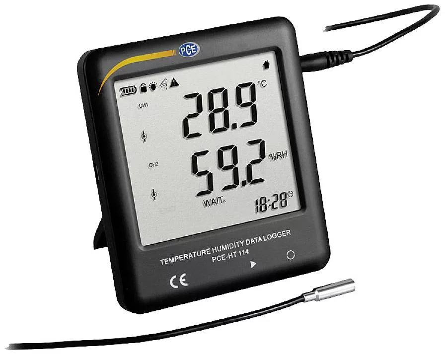 Hűtőszekrény higrométer PCE-HT 114 Hűtőszekrény adatgyűjtő hőmérséklet és páratartalom / LCD / 25 920 mért érték memória / gyors leolvasás USB-n keresztül / állítható riasztási határértékek / külső érzékelő A PCE-HT 114 higrométer hőmérséklet és páratartalom érzékelővel rendelkezik 2 méteren kábel. A PCE-HT 114 higrométer rögzíti a hűtőszekrény belsejében a hőmérsékletet és a páratartalmat, és egyidejűleg megjeleníti az LCD kijelzőn. A PCE-HT 114 nedvességmérő a mért értékeket a szoftver által elemzésre használt formátumban és PDF formátumban is elmenti. A nedvességmérő által létrehozott PDF dokumentumban egy grafikon látható, amely a mérési folyamatot mutatja. Az összes mért érték áttekintése közvetlenül a mérési jelentésben is megjelenik. A higrométer hátulján állvány és tartókonzol található. Az akkumulátor kímélése érdekében a kijelző kikapcsolható. A PCE-HT 114 higrométer akár 25 920 mért értéket is elmenthet, melyek a szoftver segítségével kiértékelhetők. A PC-vel való kapcsolat létrehozásához a nedvességmérő USB interfésszel rendelkezik. A szoftver magas vagy alacsony hőmérséklet esetén is használható riasztások beállítására. Az opcionálisan elérhető külső érzékelőre a szoftveren keresztül is át lehet váltani.
