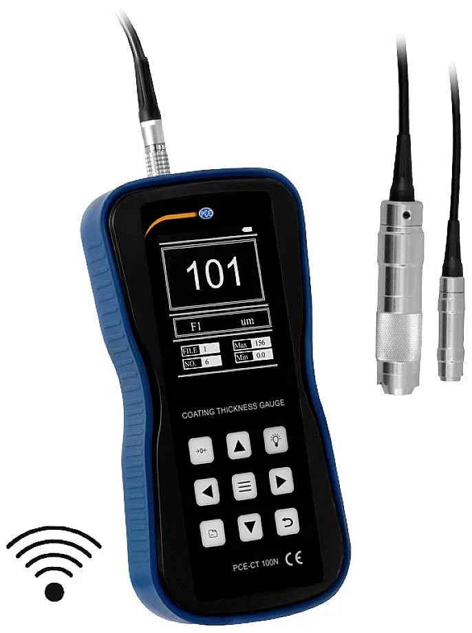 Vastagságmérő készülék vas- és színesfémekhez / nagyon kompakt méret / roncsolásmentes, pontos mérések / adatátvitel USB-n és Wifi-n keresztül / egyszerű kezelés / egyszerű és megbízható A vastagságmérő készülék a mágneses indukció (ISO 2178) ill. az örvényáramú módszer (ISO 2360). Ezeket a vastagságmérő készülékkel támogatott módszereket az anyagok roncsolásmentes vizsgálatára használják. Ez a mágneses vagy nem mágneses alapanyagon lévő, mágnesesen semleges rétegek vastagságának mérésére szolgál a vastagságmérő készülékkel. A vastagságmérő készülék ideális a megbízható helyszíni bevonatvastagság mérésekhez. A külső szondával a rétegvastagság gyorsan és egyszerűen mérhető, még nehezen hozzáférhető helyeken is. A vastagságmérő készüléket roncsolásmentes, gyors és pontos bevonatvastagságmérésre fejlesztették ki, és könnyen használható. A mért adatok egyszerűen átvihetők PC-re USB adattároló eszközzel vagy WiFi-n keresztül. A vastagságmérő készüléket különösen a feldolgozóiparban, a galvanizálásban, a hajó- és hídépítésben, a repülőgépgyártásban, valamint a gép- és vegyiparban használják.
