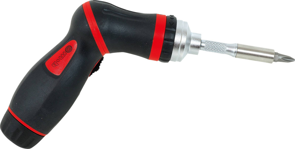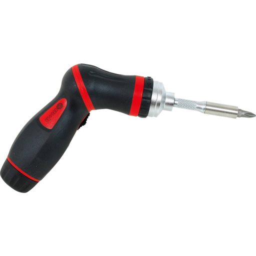 Racsnis csavarhúzó kétkomponensű fogantyúval és 7 bit egy buborékfólián. 8 ° -os követési szög (46 fog). Szabadon választható kézzel 3 állásból (meghúzás, lazítás, rögzítés). Ezen felül 2 helyzet: egyenes vagy szögletes. A tár be van építve a fogantyúba.
