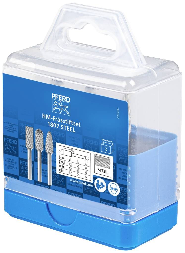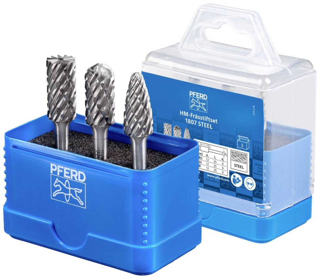 Az 1807 STEEL készlet három keményfém sorját tartalmaz acél és acélöntvény megmunkálásához a leggyakoribb formákban és méretekben. Az ütésálló műanyag doboz védi a szerszámokat a szennyeződéstől és a sérüléstől.