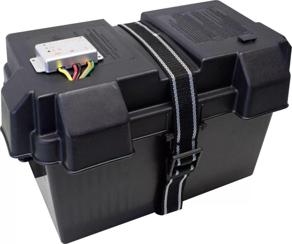 Stabil és időjárásálló doboz beépített és vízálló IP68 védettségű napenergia-töltő vezérlővel. Ilyen módon az újratölthető akkumulátorok ideálisan védettek a széltől és az időjárástól, és az akkumulátor töltöttségi állapota bármikor kívülről leolvasható a napelemes töltésvezérlő LED-jén.