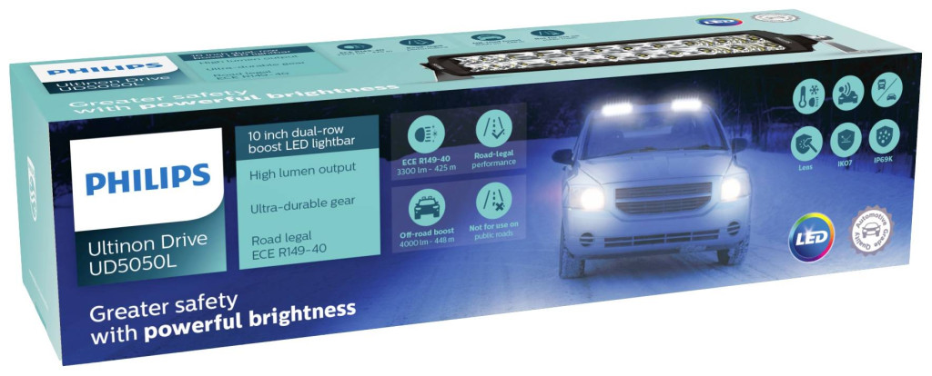 Az Ultinon Drive 5000L sorozat LED-es segédfényszóróinak hatótávolsága modelltől függően kb.400-tól 458-ig terjed, és az ECE-R149 (37,5-től 50-ig terjedő hivatkozási számokkal) személygépkocsikhoz és teherautókhoz engedélyezett. A nagyobb fényerő révén nagyobb biztonságot nyújtanak, tartósak, korróziómentesek és ellenállnak a víznek és az ütéseknek. Az UD5050L fel van szerelve az Off-Road Boost funkcióval is, amely kiváló, 4000 lumenes teljesítményt szabadít fel, és további láthatóságot biztosít az igényes terepen.