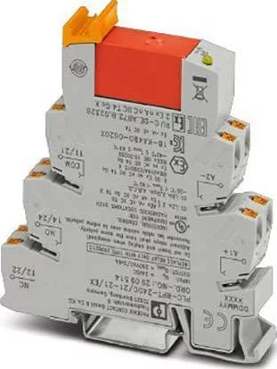 PLC-INTERFACE, amely egy 14 mm-es sínre szerelhető alapcsatlakozóból áll bepattintható csatlakozással és dugaszolórelével tápfeszültség-érintkezővel, 2 váltó érintkezővel, bemeneti feszültség 24 V DC. Az ATEX / IECEx (2. zóna) és az Ex Zone I. osztály, Div. második