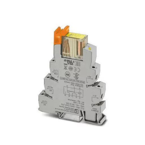 PLC-INTERFACE, amely relélapból és dugaszolható biztonsági relékből áll, a DIN EN 50205 szerint pozitív meghajtású érintkezőkkel, csavaros csatlakozás, 2 váltóérintkezős pozitív meghajtású, bemeneti feszültség: 24 V DC