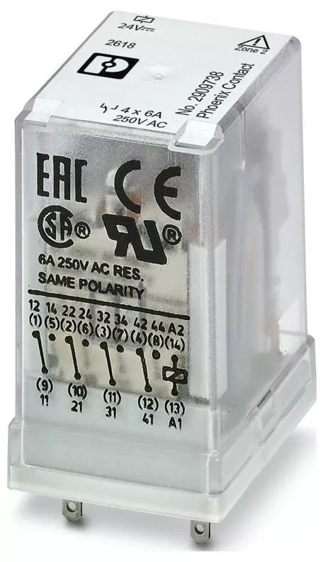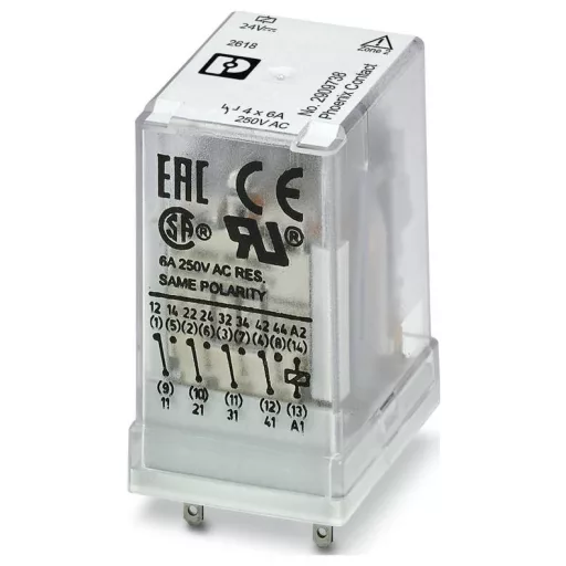 Dugaszolható ipari relé, RT III tömített, erősáramú érintkezőkkel, 4 váltóérintkező, mechanikus kapcsolási helyzetjelző, polaritás: polarizációmentes, bemeneti feszültség: 24 V DC, RIF-2.../EX aljzatokkal együtt ATEX/IECEx (2. zóna) és Ex-zóna I. osztály, 2. div. szerint jóváhagyva.