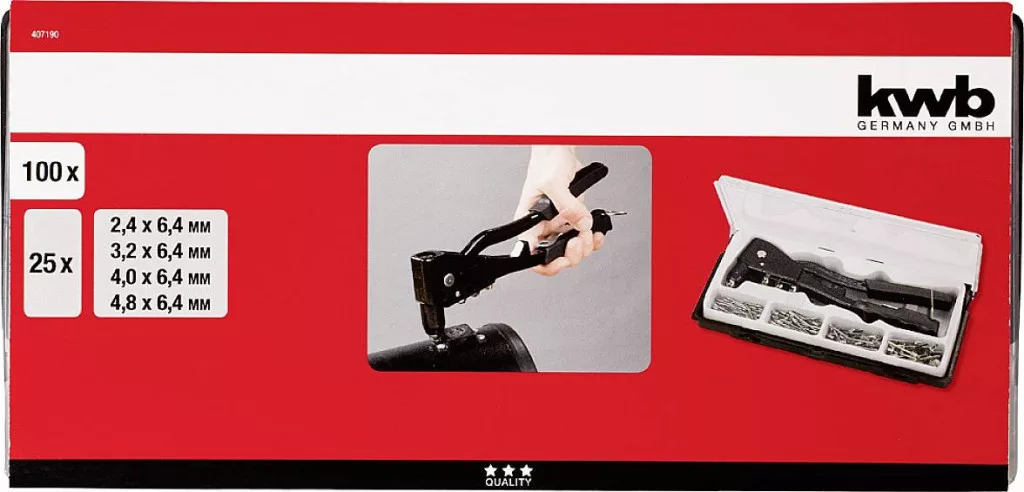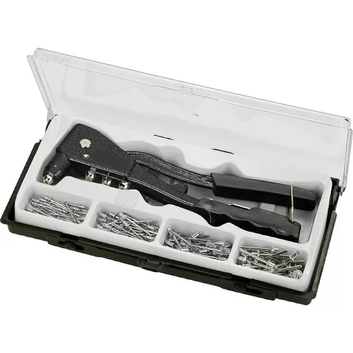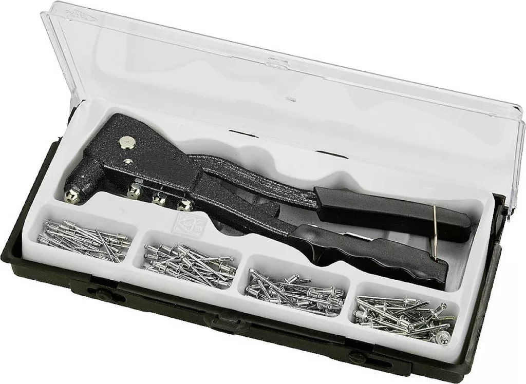 Nagy teherbírású kivitel markolatvédelemmel, alumíniumból és rézből készült vakszegecsekhez 4,8 mm-es szárátmérőig, egyéb anyagokból 4 mm-es szárátmérőig, 100 szegecs méretben: 25 szegecs 2,4 x 5 mm, 25 szegecs 3,2 x 8 mm, 25 szegecs 4,0 x 8 mm, 25 szegecs 4,8 x 8 mm.