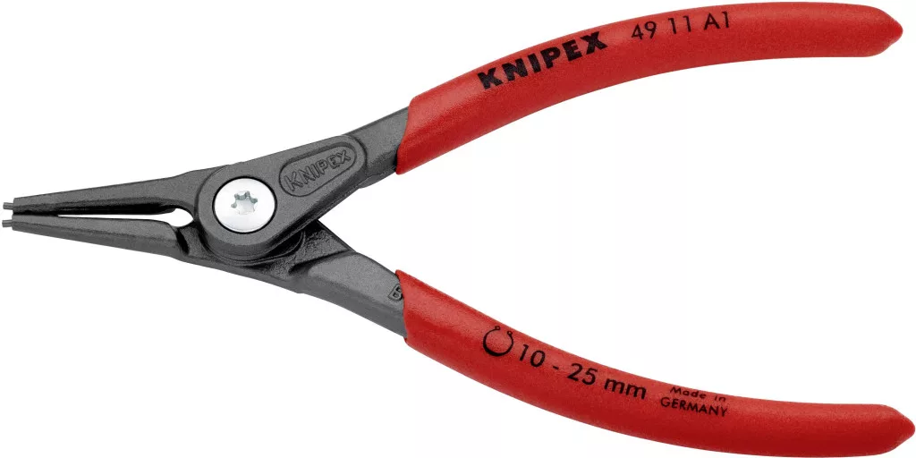 Műszaki adatok: Alkalmas tengelyátmérők: 10-25 mm · Anyag: Króm-vanádium golyóscsapágy acél · Anyagjellemző: Edzett · Gyártói szám: 49 11 A1 · Hegy forma: Egyenes · Méret, hossz: 140 mm · Szabvány: DIN 5254 A · Súly: 100 g · Típus: Seeger gyűrű fogó