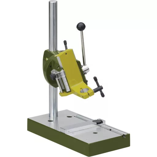 Jellemzők: 20 mm-es befogó illesztés a MICROMOT fúró- és marókészülékekhez · Masszív, keménykrómozású acél oszlop (280 x 20 mm) · Kinyúlás 140 mm (az oszlop középtől a szerszám közepéig) · Síkra mart asztal (220 x 120 mm) párhuzamos felütköztetéssel és skálával · Menetes furat a KT 70 MICRO koordináta asztal rögzítéséhez · Konzolos fej, fecskefarok vezetéssel 90 fokig billenthető.