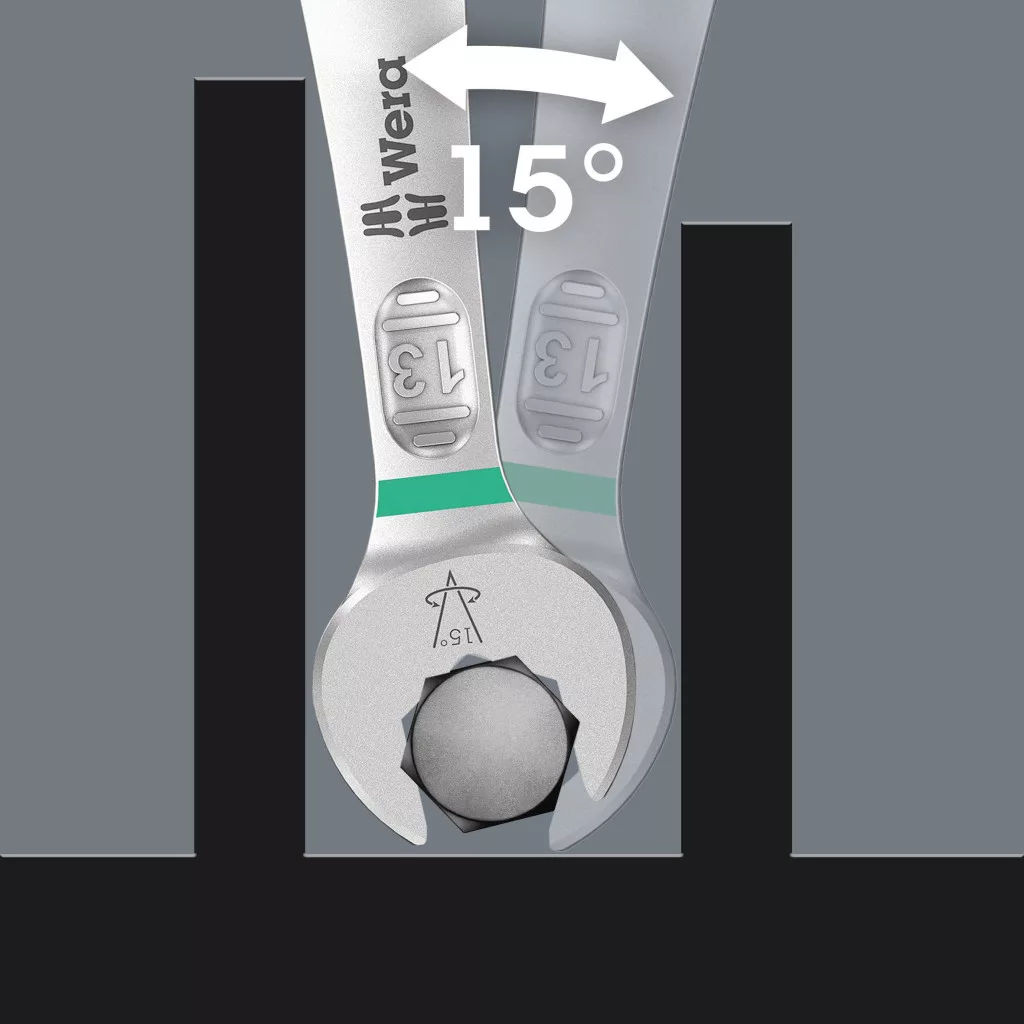 Mivel a csavarozási munkák beépítési helye egyre szűkebb, olyan eszközökre van szükség, amelyekkel a felhasználók sikeresen dolgozhatnak ilyen helyzetekben. A szűk beépítési helyek további rögzítési pontokat igényelnek a szerszámhoz. Tehát a villáskulcsokat lehet úgy módosítani, hogy a szerszám alkalmazási lehetőségei növekedjenek? A 7,5°-ban elforgatható pofa és a kettős hatszögletű geometria kombinációja megduplázza az alkalmazási pontokat. A csavarozás során a csavarkulcs hossztengelye körüli ismételt 180°-os elforgatásával négy rögzítési lehetőség áll rendelkezésre, és 15°-onként "pakolható" az anyák vagy csavarfejek. A Joker 6003 okos pofageometriájával jelentősen kibővíti a felhasználási kört a szűk helyeken. A Joker 6003 úgymond magától megtalálja a megfelelő kiindulási pontot minden kanyar után. A vékony, de robusztus gyűrűoldal 15°-os szöget zár be a szerszám tengelyéhez képest. A kiváló minőségű felületkezelés magas és tartós korrózióvédelmet biztosít. A Take it easy eszközkeresővel: színkódolás méret szerint. A Joker táskák falakra, polcokra, műhelykocsikra és a Wera 2go rendszerre rögzíthetők a hátul lévő tépőzáras rendszernek köszönhetően.