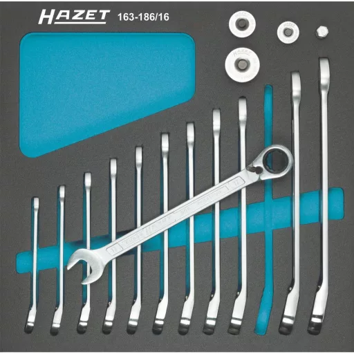 16 részes racsnis gyűrűs-villáskulcs készlet négyszög adapterekkel komplett (2/3) · Safety-Insert-System - Az összes szerszám rázkódásmentesen beágyazva - Ha hiányzik egy szerszám, az rögtön feltűnik · A betétek tisztíthatók (Folyó víz alatt kefével kell letisztítani és már kész is!). · Illik minden fiókos HAZET Assistent szerszám kocsiba — — Az Assistent 173, 179 és 180 szerszám kocsik esetében kiegészítés céljából ajánljuk még a 173-36/5 műanyag betétet vagy a 163-522x40 ill. 163-522x50 habszivacs betéteket. Tartalma: — 606-8 9 10 11 12 13 14 15 16 17 18 19 — 606-63 850 880 900