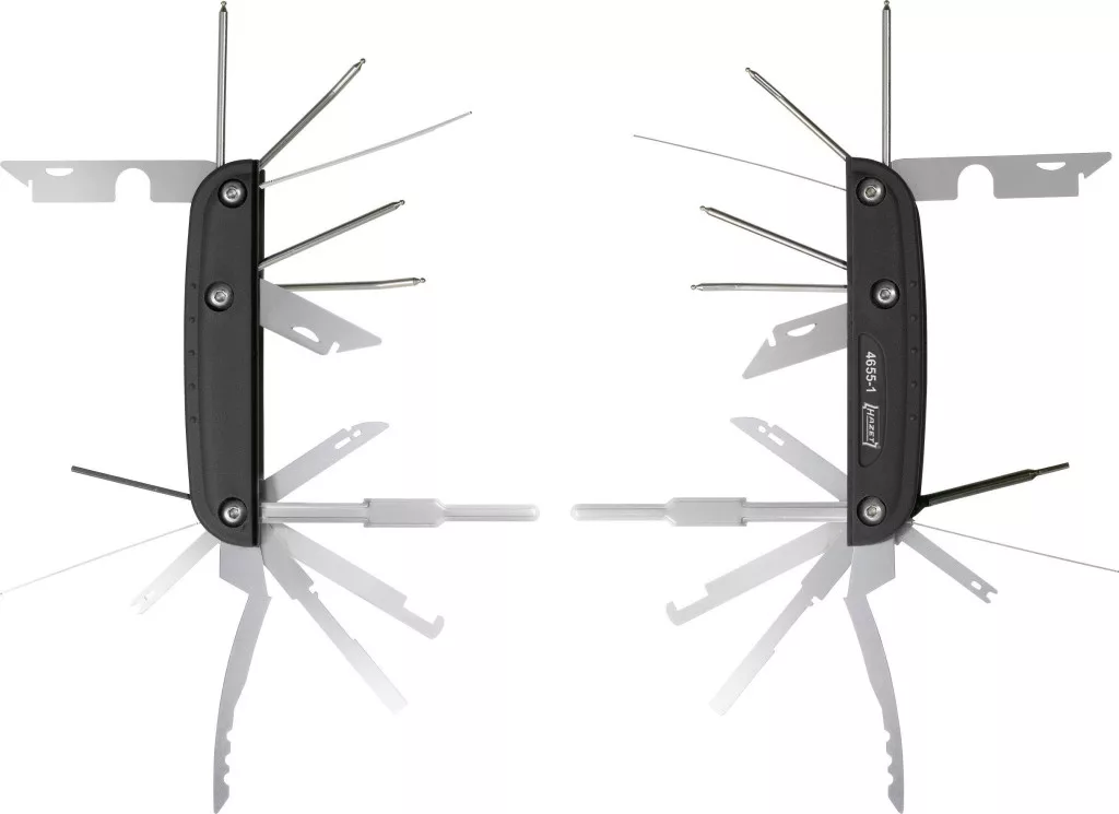Jól kézbeillő univerzális eszköz az autórádió be- és kiszerelésére, sok gyártó és forgalmazó termékéhez. Minden egyetlen készletbe van gyűjtve, nem kell keresgélni a megfelelő szerszámot. Sokféle kioldó szerszám egy kompakt eszközben, VW, Audi, Ford, BMW, Mercedes-Benz, Porsche, Opel, Skoda, Fiat, Kenwood, Sony, Clarion, Blaupunkt és sok más típushoz.