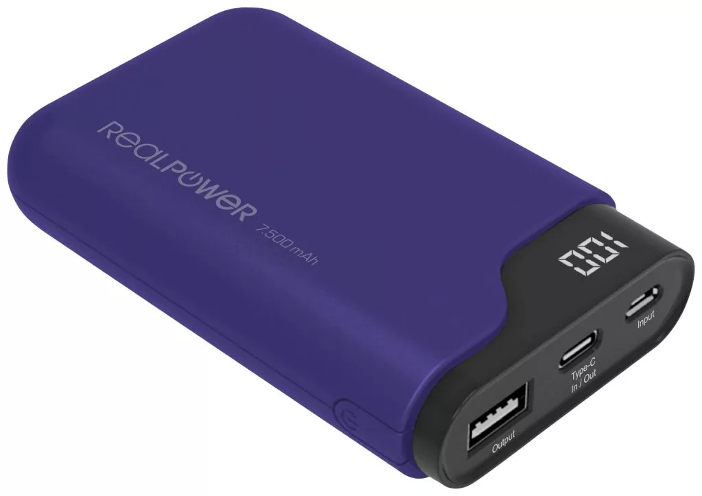 A RealPower PB-7500C extra energiát biztosít útközben. A mobiltöltő USB töltőporttal és USB Type-C csatlakozóval is rendelkezik, amely bemenetként és kimenetként is használható. Okostelefonok, tablet PC-k vagy más mobil eszközök csatlakoztathatók ilyen módon. A power bank integrált akkumulátorral rendelkezik, kapacitása 7500 mAh, és egyszerre akár két eszközt is tölthet. A digitális kijelző tájékoztat a powerbank aktuális állapotáról.