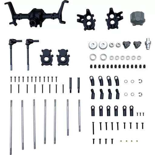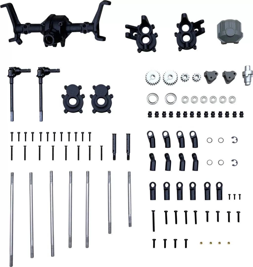 Szállítás tartalma: 2x portál tengely elöl, Első vezetőkar készlet, Hajtómű, Csapágy készlet differenciálzárral