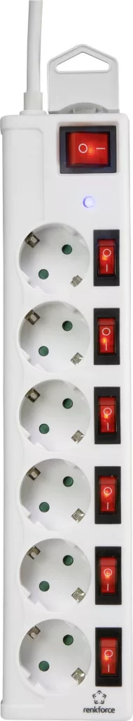 Műszaki adatok: Alkalmazási terület: Beltér · Anyag: Műanyag · Csatlakozási teljesítmény: 3500 W · Dugaljak száma: 6 · Gyermekvédelem: Igen · Hálózati elosztó jellemzők: Túlfeszültség elleni védelem,Kapcsolóval,Gyermekvédelem,null · Kábel típus DIN/VDE szerint: H05VV-F 3G 1,5 mm² · Kábelhossz: 1.50 m · Levezető áram: 9 kA · Méret, hossz: 325 mm · Méret, magasság: 39 mm · Méret, szélesség: 70 mm · Szín: Fehér · Típus: Túlfeszültség ellen védő elosztó