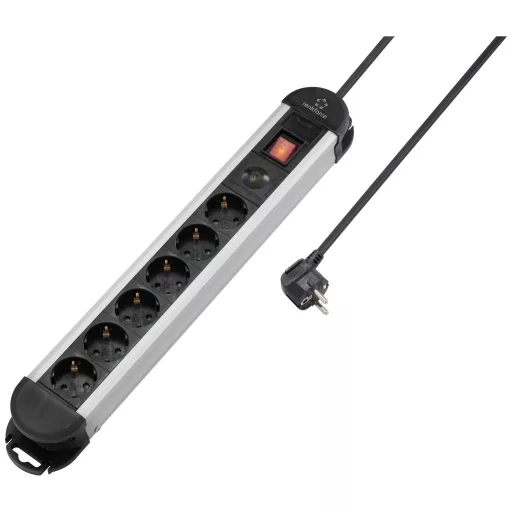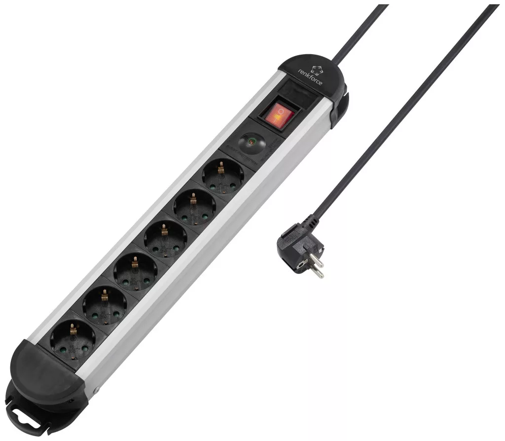 Technical specifications: Alkalmazási terület: Beltér · Anyag: Műanyag · Csatlakozási teljesítmény: 3680 W · Dugaljak száma: 6 · Hálózati csatlakozó típus: Védőérintkezős · Hálózati elosztó jellemzők: Túlfeszültség elleni védelem,Kapcsolóval,Gyermekvédelem · Kábel típus DIN/VDE szerint: H05VV-F 3G 1,5 mm² · Kábelhossz: 5 m · Levezető áram: 12 kA · Méret, hossz: 476 mm · Méret, magasság: 49 mm · Méret, szélesség: 67 mm · Működés jelző: Optikai · Szerelési mód: Szerelési lyukak · Szín: Fekete,Alumínium · Üzemi feszültség: 230 V