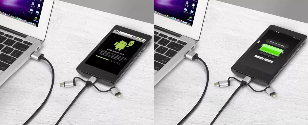 A Renkforce mikro USB/Lightning/USB-C™ 3 az 1-ben kábel alkalmas arra, hogy a mikro USB- vagy /USB-C™ csatlakozójú okostelefont/tabletet valamint a Lightning csatlakozójú iPad, iPod és iPhone készülékeket a számítógép/MAC vagy USB csatlakozójához csatlakoztassuk. Így mindig kéznél van a mobil készülékhez megfelelő töltőkábel. Szinkronizálja az adatokat másodpercek alatt és közben töltse a végkészüléket is.