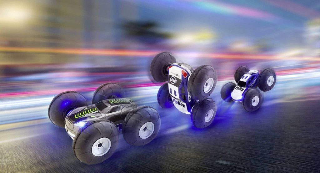 A 2-oldalas autó egyben a vadász és az üldözött is. Minden egyes átfordulásnál a másik szerepet veszi át. Nagy ballonos kerekek támogatják, külön kerékmeghajtással és LED-es fényszóróval, így a sötétben is pontosan vezérelhető. Azonnal használatra kész, nincs hosszas töltési idő.