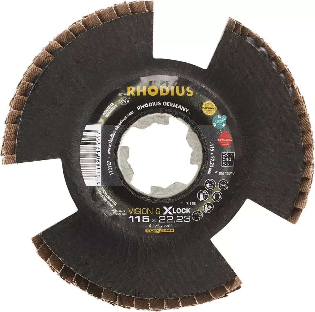 RHODIUS VISION SPEED X-LOCK, 10 lapos tárcsa 115 x 22,23 mm, szögletes, szemcse 40, TOPline, Németországban gyártott, rozsdamentes acélhoz, acélhoz, színesfémekhez