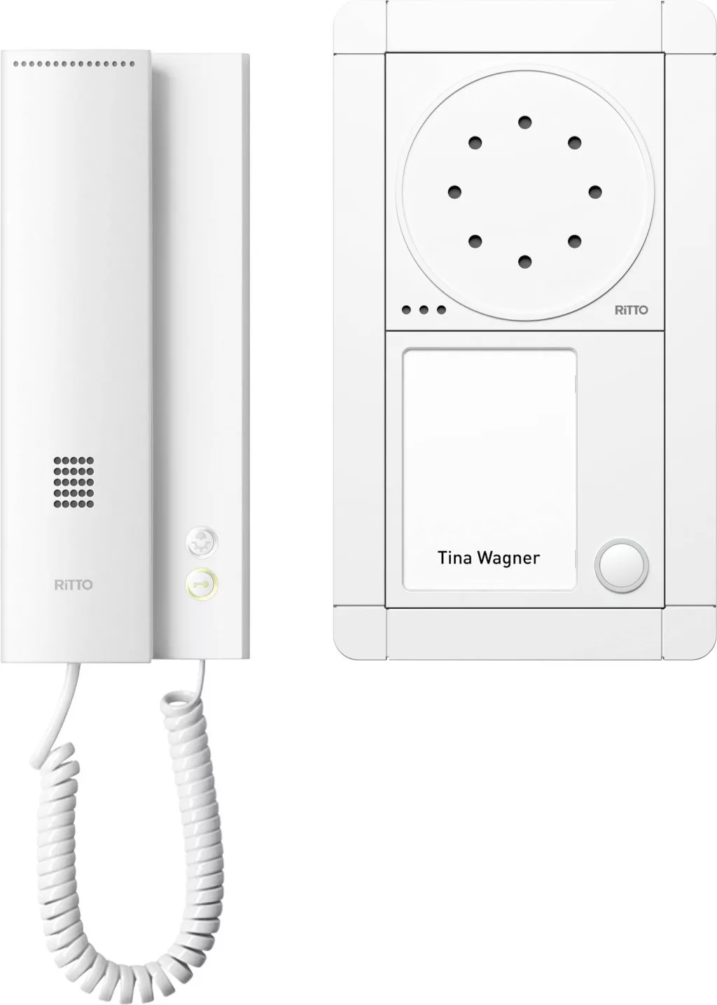 Szállítás tartalma: 1x kaputelefon kaputelefon, 1x gomb modul csengőgombbal és névjelzővel (megvilágított), 1x keret AP 2-szeres, 1x lakossági telefon, 1x tápegység.