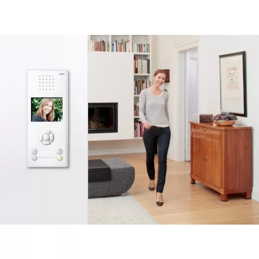 Műszaki adatok: Anyag (kültéri egység): ABS · Dallamok száma: 20 · Felbontás: 320 x 240 pixel · Gyártói szín: Fehér · Kijelző típus: Színes TFT/LC · Képernyő Ø (coll): 3.5 coll · Méret, magasság: 91 mm · Méret, mélység: 24 mm · Méret, szélesség: 221 mm · További műszaki adatok: Híváskülönbség ajtó / padló / házhívás eseténOptikus hívásjelzés hívási felület relé hívás memória1 gomb, konfigurálható hangerő-szabályozás · Tápellátás: Hálózati tápegység rendszer buszról