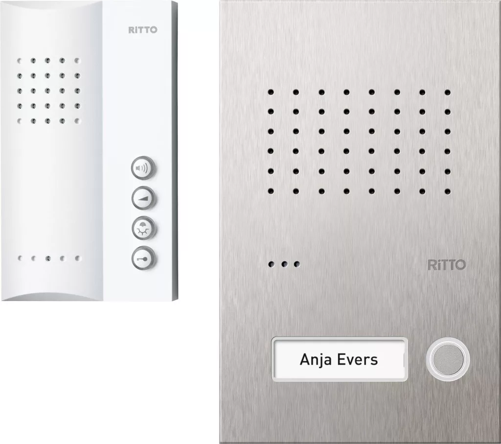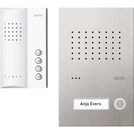 Szállítás tartalma: 1x Acero tiszta rozsdamentes acél ajtóállomás, 1x lakossági telefon fehér, 1x tápegység.