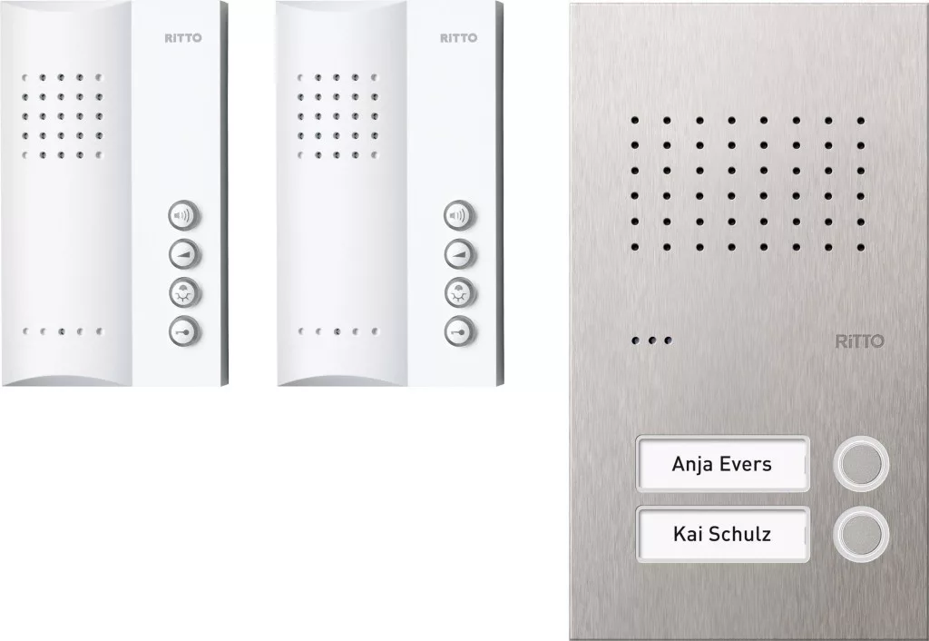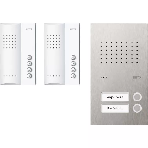 Szállítás tartalma: 1x Acero tiszta rozsdamentes acél ajtóállomás, 2x kihangosító fehér, 1x tápegység.