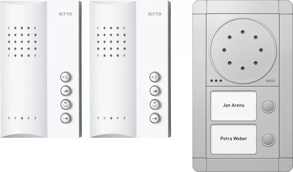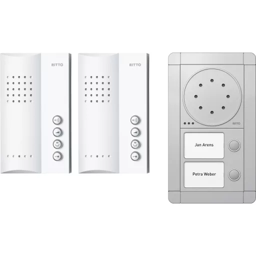 Szállítás tartalma: 1x kaputelefon kaputelefon, 1x gomb modul csengőgombbal és névjelzővel (megvilágított), 1x keret AP 2-szeres, 2x kihangosító, 1x tápegység.