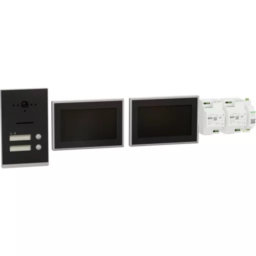 A Listo Video kétlakásos ház szett Twin_Bus IP ötvözi a vonzó dizájnt az intelligens kommunikációs technológiával. A kétszintes családi ház szett a következő elemekből áll. Listo kapuállomás kétlakásos házakhoz, süllyesztett kivitelben, antracitszürke előlappal, ezüst alumínium kerettel és süllyesztett dobozzal. Két Twin_Bus IP beltéri állomás 7 hüvelykes érintőképernyővel, fekete előlapi kialakítással, vízszintes vagy függőleges szereléshez. Az integrált WIFI funkció lehetővé teszi a kommunikációt a Twin_Bus IP alkalmazással, így a kapuhívások mobil eszközökön is fogadhatók, még útközben is. Két REG tápegység a Twin_Bus IP rendszer tápellátásához. Egy REG buszszűrő a Twin_Bus IP rendszer interferenciájának csökkentésére.