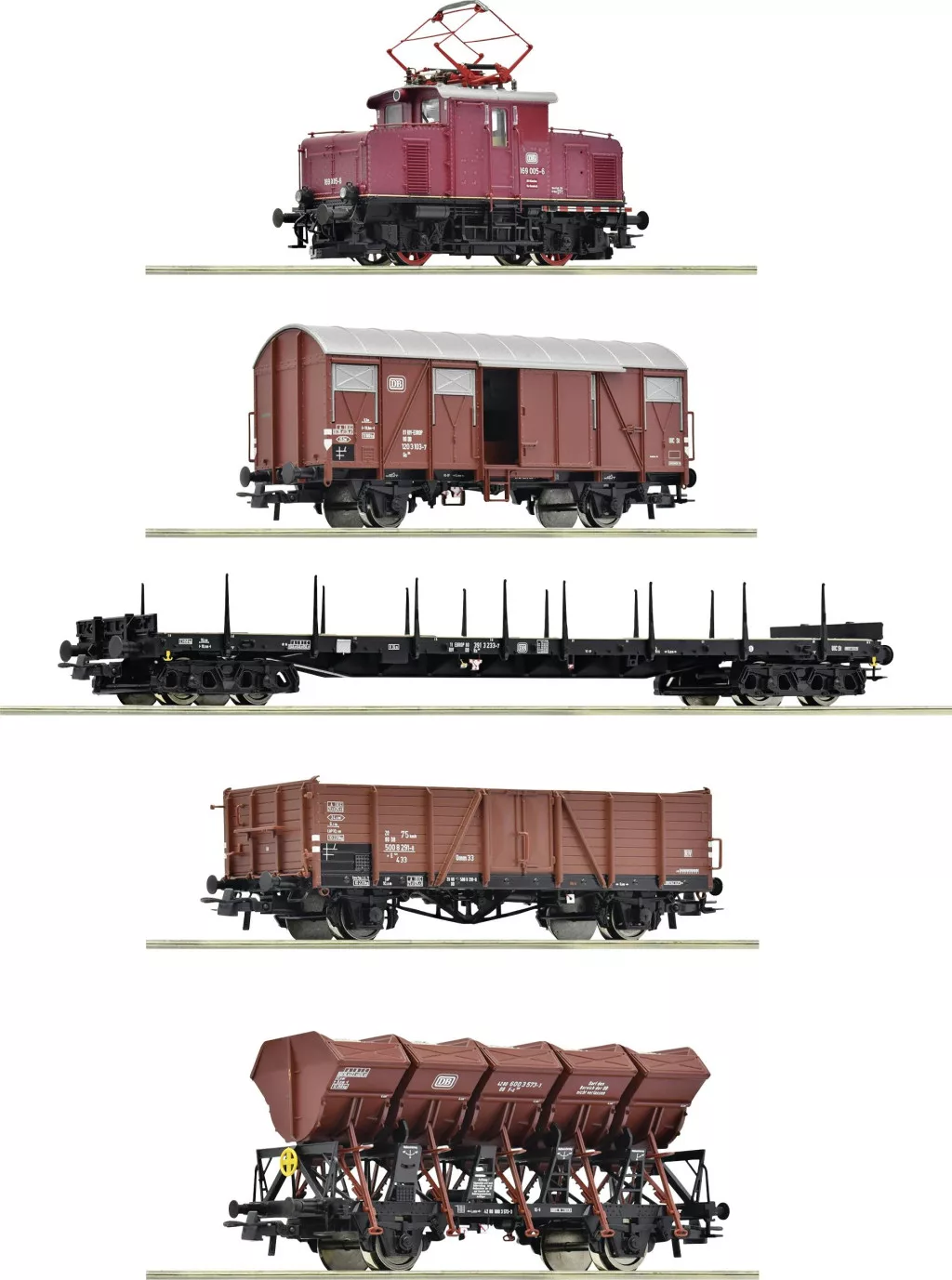A 169 005-ös villanymozdonyból, egy Gs típusú fedett tehervagonból, egy Rs típusú 4 tengelyes tétkocsiból, egy E típusú nyitott teherkocsiból és egy Fz 120 típusú billenőkocsiból áll.
