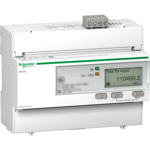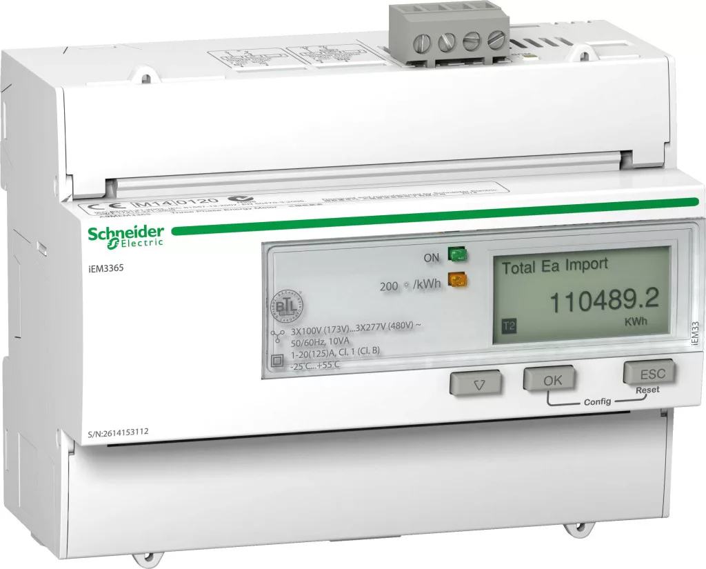 IEM3365 energiafizető, 3 fázisú, 125A, BACnet, 1E / 1A, 4 tarifa. Sorozat: Acti 9 - Terméknév: Acti 9 iEM3000 - Az egység rövid neve: iEM3365 - Termék vagy alkatrész típusa: Energiafizető.
