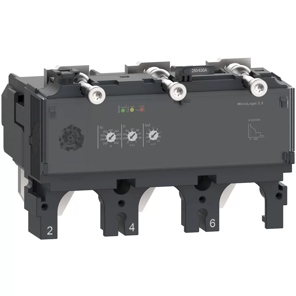 Ez a MicroLogic 2.3 egy 3 pólusú 3D elektronikus kioldóeszköz, amelyet a ComPacT NSX 400/630 megszakítókon használnak. Ez a 400 A besorolású elektronikus trigger készülék a legjobb választás minden szabványos és speciális alkalmazáshoz. Állítható, hosszú távú túlterhelés elleni védelemmel rendelkezik. Állítható rövid távú védelmet és fix, azonnali rövidzárlat elleni védelmet is kínál. A MicroLogic 2.3 riasztási LED-ekkel jelzi a túlterhelést. A zöld Ready LED villog, ha a megszakító készen áll a kioldásra. Ez a termék a PowerTag NSX és a ComPacT NSX alapkapcsolókkal kombinálva az EcoStruxure Power architektúránk része.