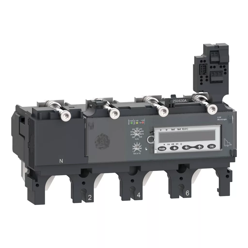 Ez a MicroLogic 5.3 E (Energy) 4 pólusú, 4d elektronikus kioldó egység a CompPacT NSX 400/630 megszakítókon használt elektronikus kioldó egység. Ez a 400 A névleges feszültségű elektronikus kioldókészülék a legjobb választás minden szabványos és speciális alkalmazáshoz. Állítható, hosszú távú túlterhelés elleni védelemmel rendelkezik. Testreszabható rövid idejű késleltetett rövidzárlatvédelmet és azonnali rövidzárlatvédelmet is kínál. A MicroLogic 5.3 E riasztási LED-ekkel jelzi a túlterhelést. A zöld Ready LED villog, ha a megszakító készen áll a kioldásra. A MicroLogic 5.3 E kijelzőmodullal van felszerelve, amely lehetővé teszi az energiamérést és a finombeállítást. Ez a termék a PowerTag NSX és a ComPacT NSX alapkapcsolókkal kombinálva az EcoStruxure Power architektúránk része.