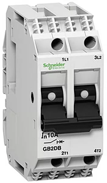 TeSys GB megszakító, 2 pólusú, 1A/415V IEC/277V UL, ipari vezérlőáramkörök védelmére. Termomágneses védelmet kínál 14 A (13-14 In) mágneses kioldási szinttel és Icu 50kA@415V megszakítóképességgel. Kompakt készülék (30 mm széles) billenőkar vezérléssel és DIN sínre gyors rögzítéssel. Több szabványnak is megfelel (IEC, UL, CSA, NEMKO) és Green Premium (RoHs/Reach).