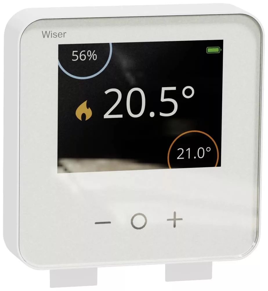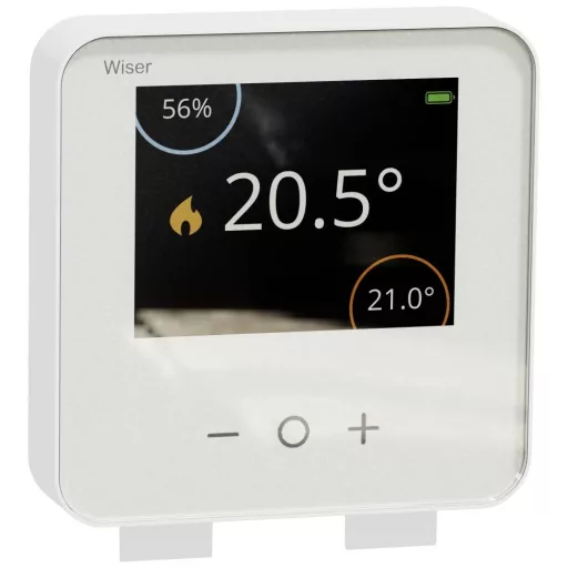 A Wiser szobatermosztát szabályozza a célhőmérsékletet a Wiser fűtésvezérlőn (Zigbee) belül. Rugalmas szobahőmérséklet szabályozás a helyszínen, akár alkalmazás nélkül is. Egy rendszeren keresztül legfeljebb 64 eszköz csatlakoztatható, beleértve a hubot. További részletek az online dokumentációban (www.productinfo.schneider-electric.com/wiser_home-dev). 76 x 76 x 25 mm Moduláris intelligens otthoni kapcsolat a Wiser rendszeren keresztül, APP vezérlés a helyszínen és távolról, menetrendek, pillanatok (jelenetek) és automatizálás a Wiser Home APP segítségével. ZigBee 3.0. Falra szerelhető vagy szabadon álló, elemes működés 2x alkáli elemmel (AA). Rendszerkonfiguráció a Wiser Home APP-on keresztül (online és offline!), további telepítési támogatás az eSetup APP-n keresztül a szakképzett villanyszerelő számára.