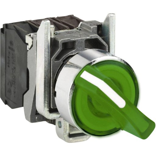 Világító választókapcsoló, zöld, 2 pozíció, 1 NO + 1 NC, reteszelés, váltó rövid, + LED 24V AC
