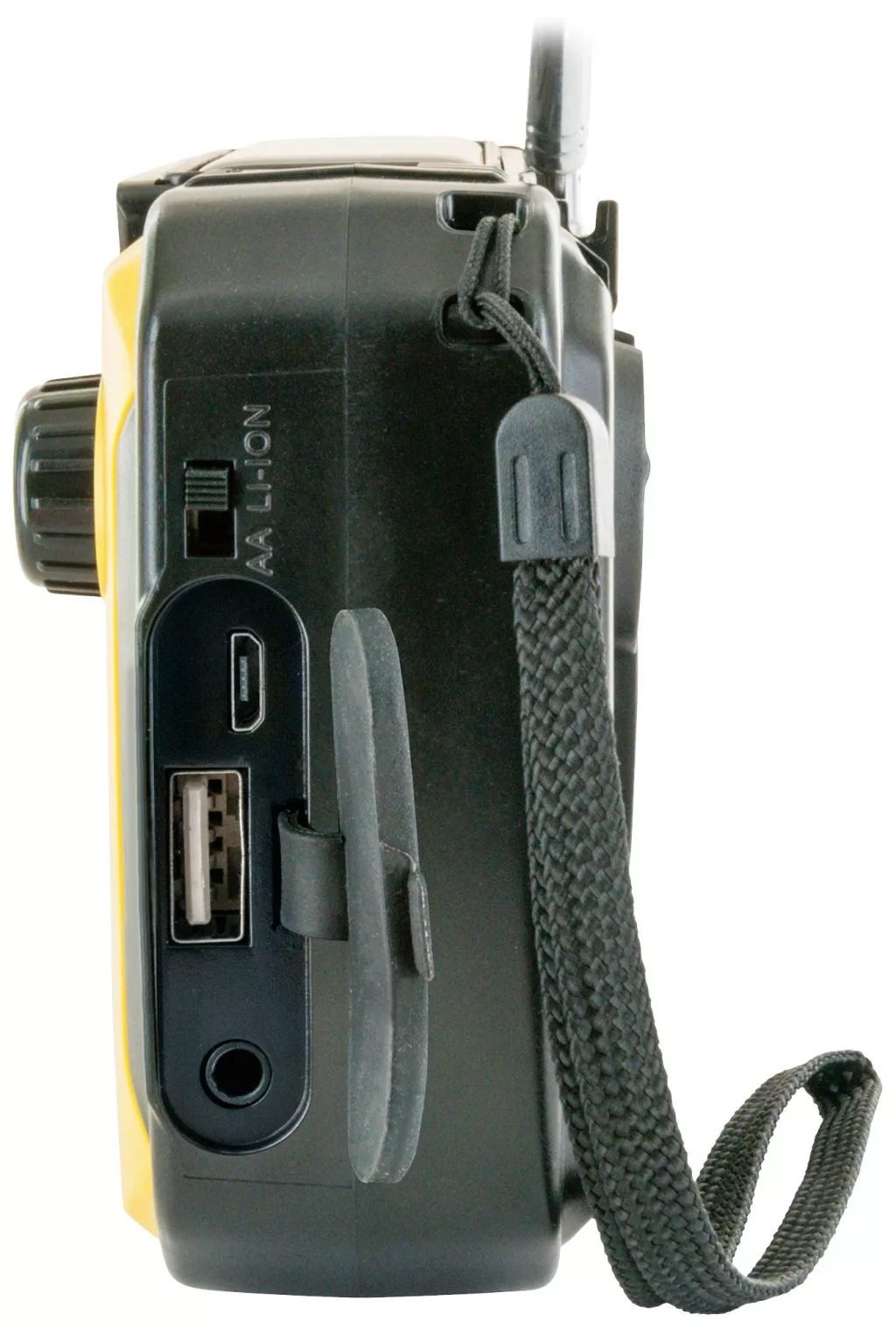 Műszaki adatok: Gyártói szín: Sárga, Fekete · HiFi jellemzők: Kézi kurbli, Napelem, Fröccsenő víz ellen védett, ütésálló, Zseblámpa · Kimeneti csatlakozók (számítástechnika/multimédia): USB-A, Micro-USB B (USB 2.0), Audio, 2.0 (3,5 mm jack) · Méret, magasság: 95 mm · Méret, mélység: 95 mm · Méret, szélesség: 156 mm · Rádió tuner: URH, AM, FM · További műszaki adatok: Védelmi típus: IP54.