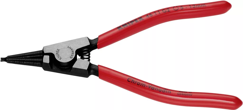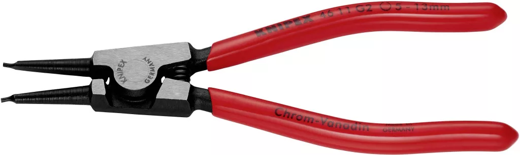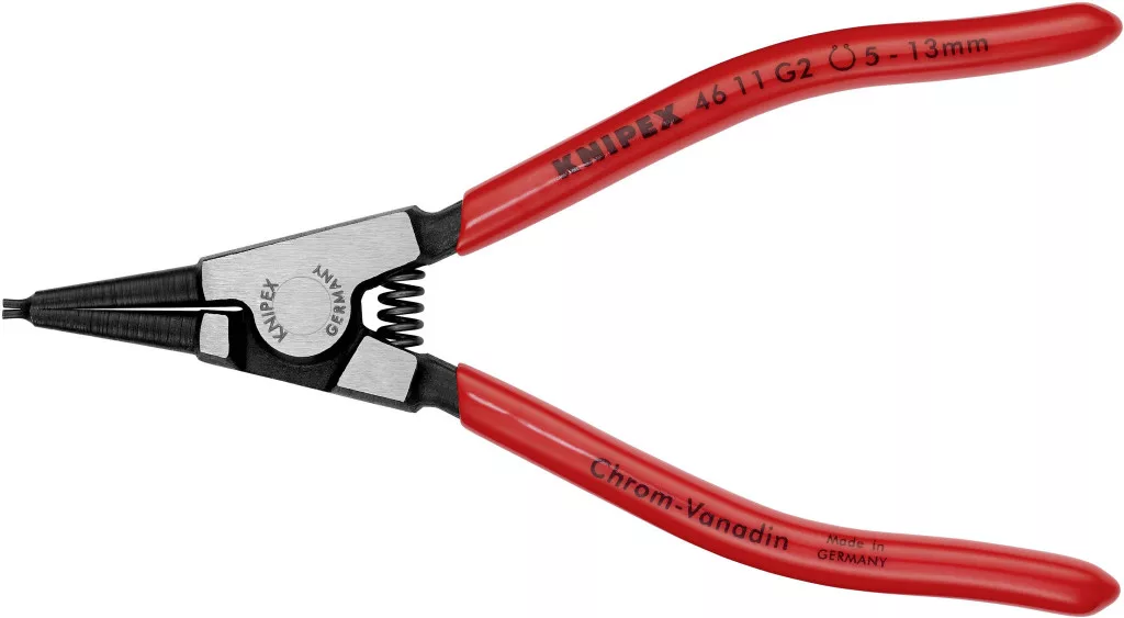 Műszaki adatok: Alkalmas tengelyátmérők: 5-13 mm · Anyag: Króm-vanádium acél · Anyagjellemző: Edzett,Polírozott · Gyártói szám: 46 11 G2 · Hegy forma: Egyenes · Méret, hossz: 140 mm · Súly: 85 g · Típus: Seeger gyűrű fogó