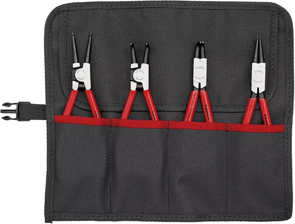 Jellemzők: praktikus, állítható gyors zárral · benne négy gyakran használt külső és belső rögzítőgyűrű fogóval · Összetekerhető, strapabíró, poliészter szövet táskában