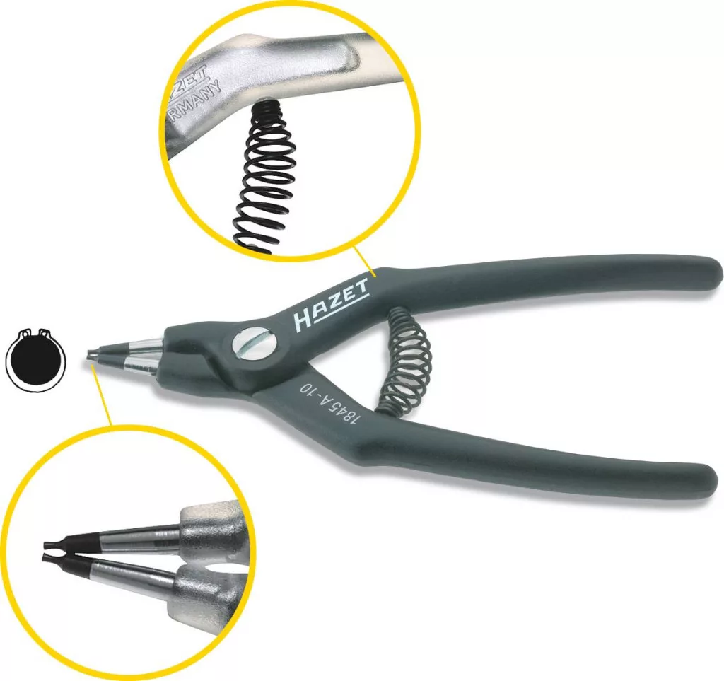 Műszaki adatok: Alkalmas tengelyátmérők: 10-25 mm · Anyag: Műanyag · Gyártói szám: 1845A-10 · Hegy forma: Egyenes · Méret, hossz: 140 mm · Szabvány: DIN 5254 A · Súly: 64 g · Típus: Seeger gyűrű fogó