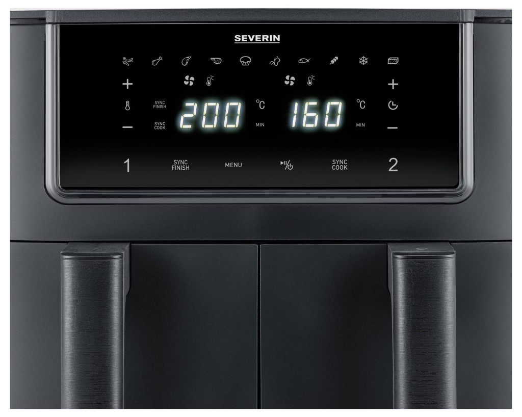 A SEVERIN FR 2463 dupla forrólevegős fritőz két külön szabályozható fritőzkosárral tűnik ki. Akár csak egy sütőkosarat használ, akár egyet 120 °C-on és egyet 200 °C-on, vagy mindkettőt egyszerre – 10 automatikus programmal vagy egyéni beállításokkal gyorsan és egyszerűen elkészítheti a főételt. Minden sütőkosár körülbelül 4 liter űrtartalmú, ami körülbelül 1300 g sült krumplinak felel meg. A konyhában a képzeletednek nincsenek határai.